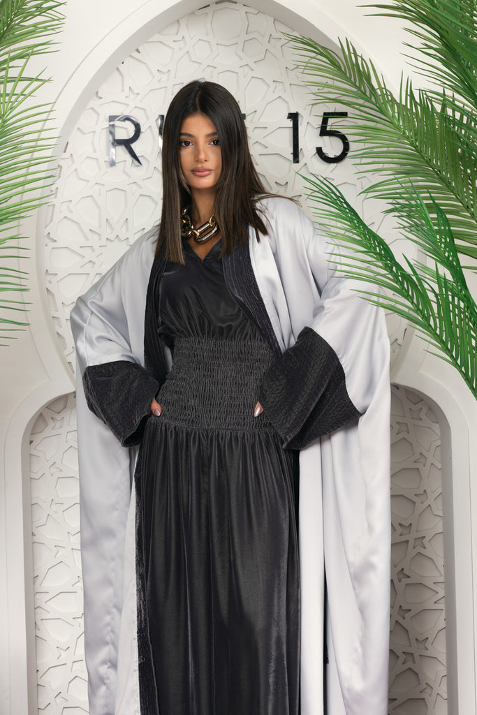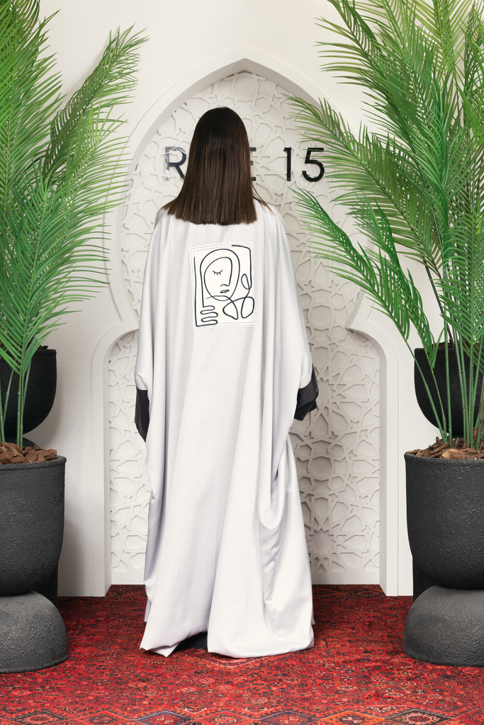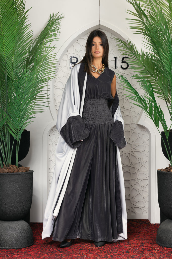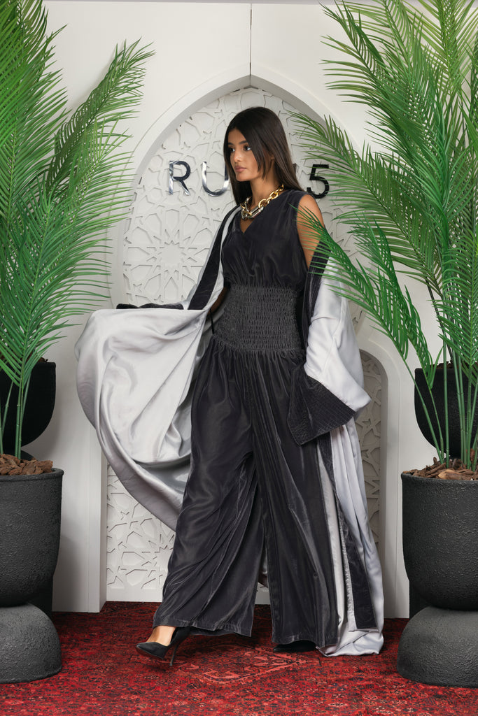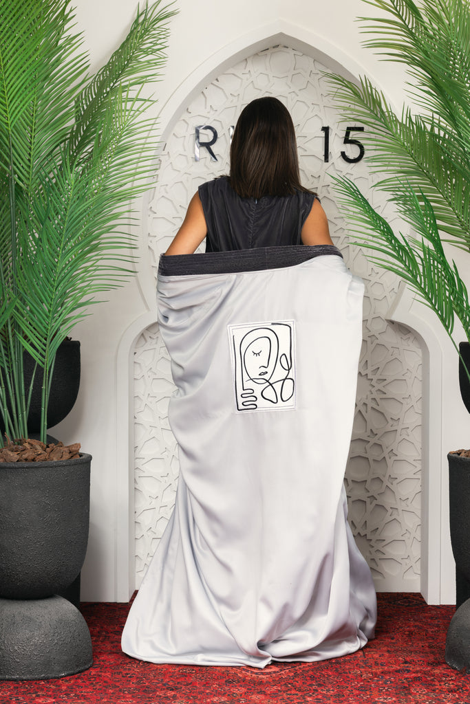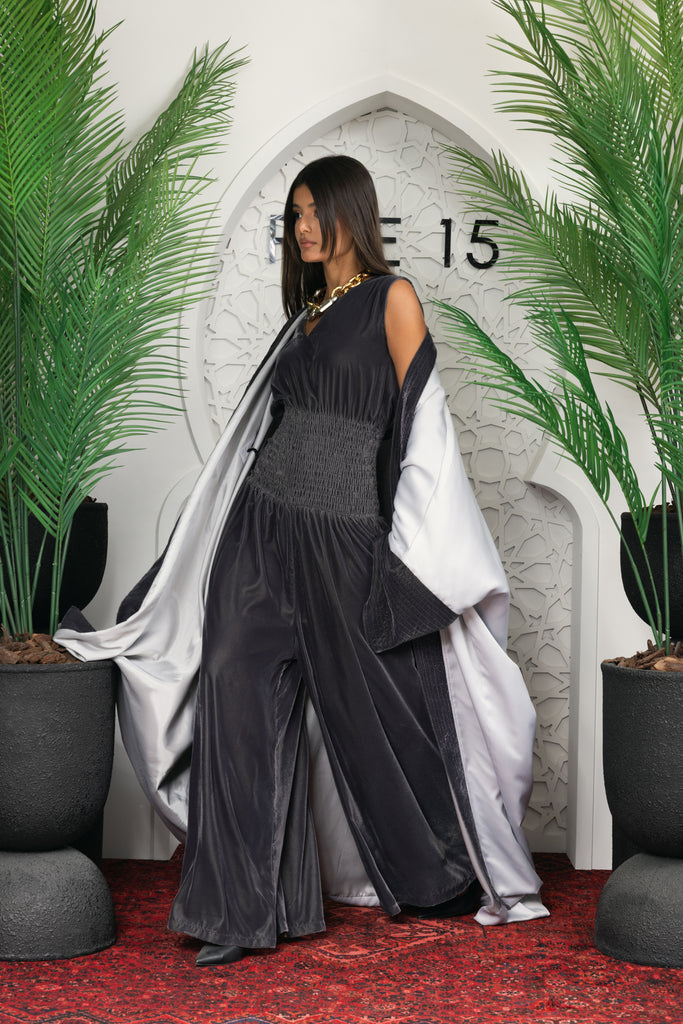 grey velvet jumpsuit with silky silver kimono set on the back an embroidered portrait of the famous picasso