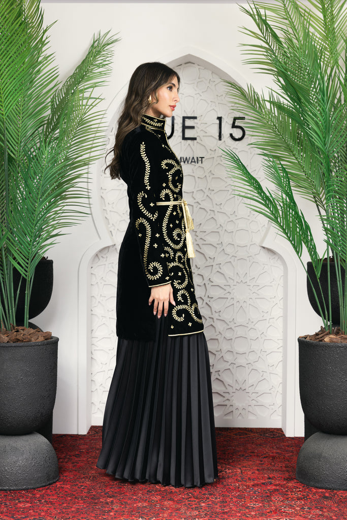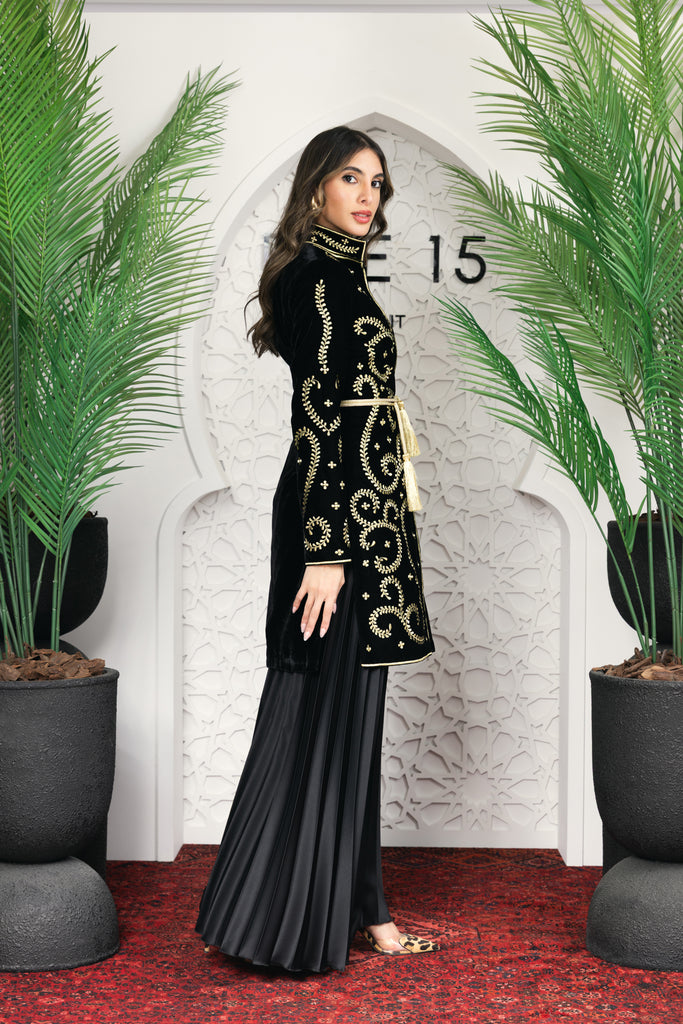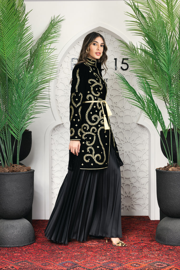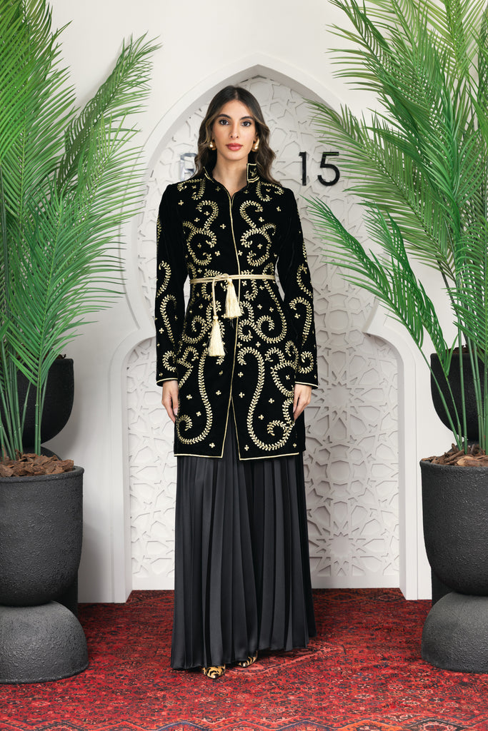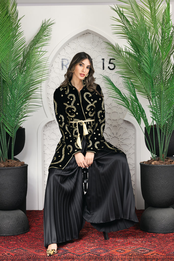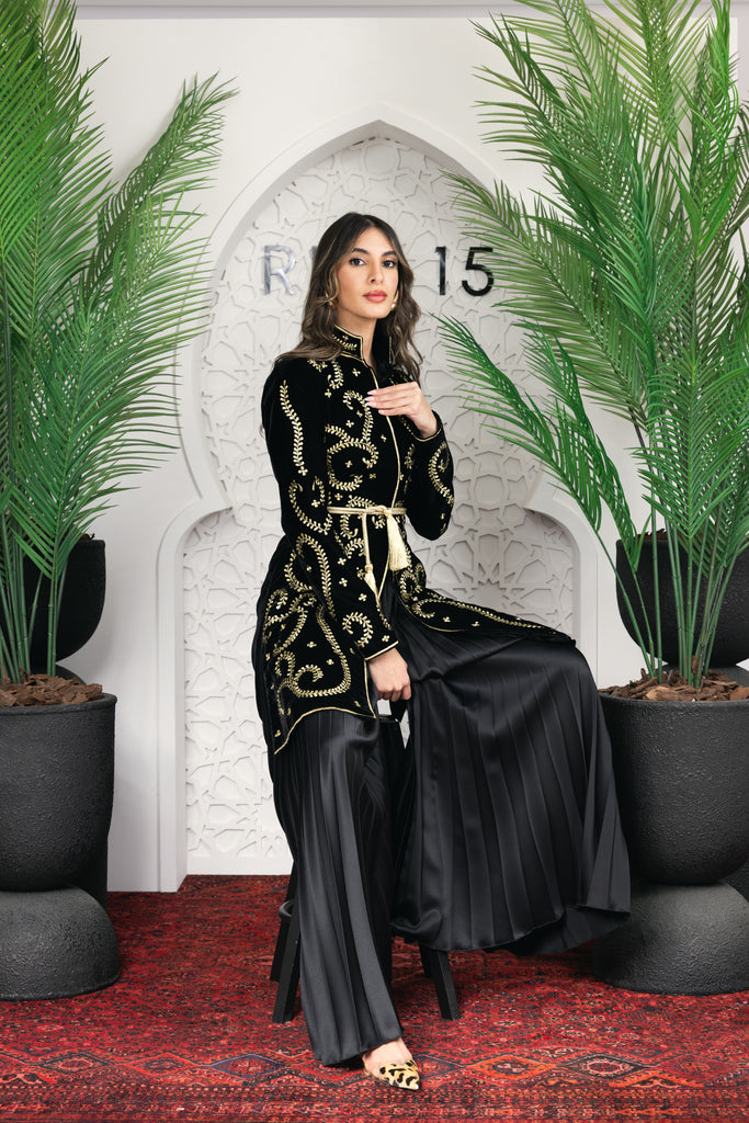 signature rue15 piece a luxurious full embroidered jacket with satin plisse oversized pants .