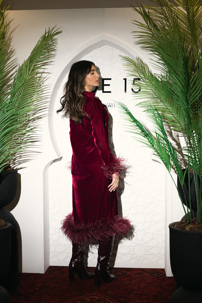 burgundy velvet dress with burgundy feathered hem
