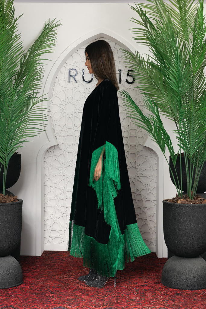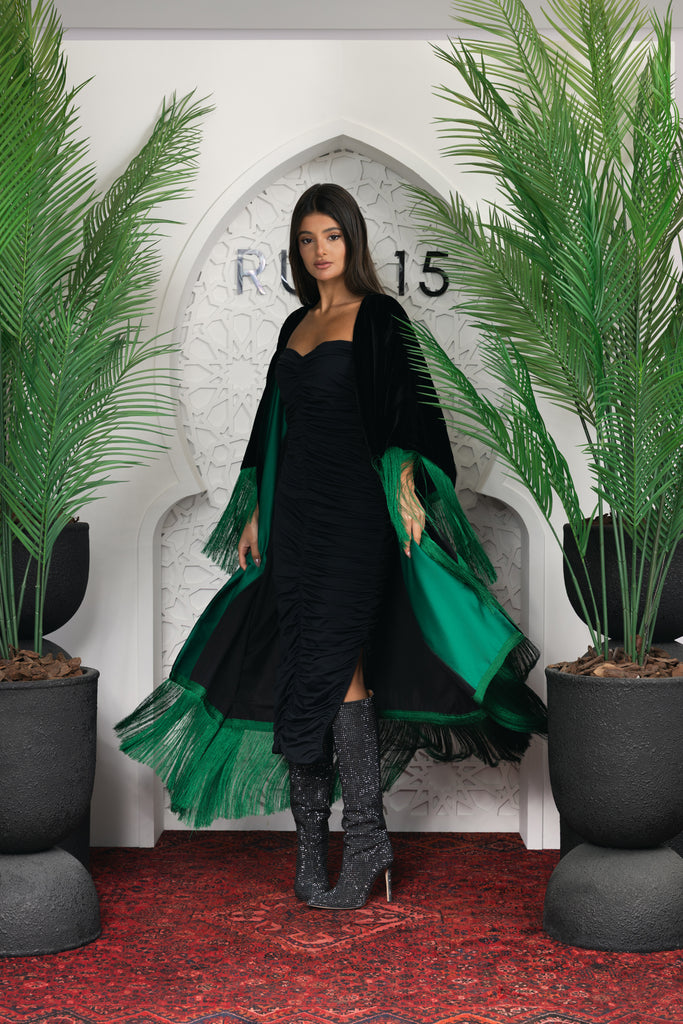 black velvet bandage dress with matching black velvet bisht with a green fringed hem